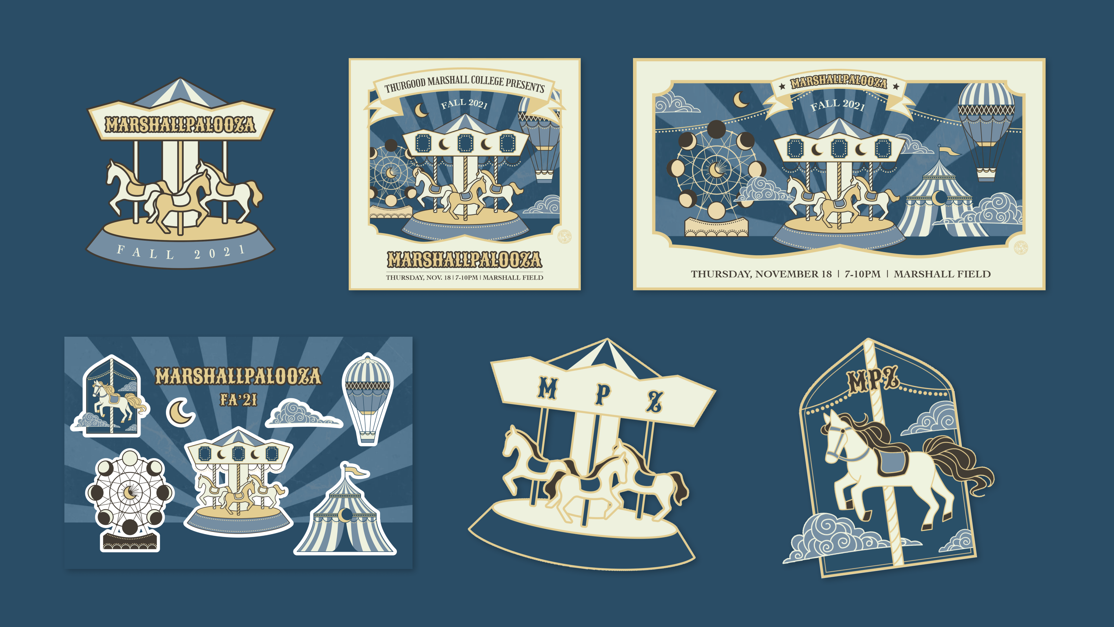 Marshallpalooza is an annual carnival-like event that features fun rides, performances, giveaways, and more. For 2021, we came up with an elegant but lively theme with a blue and gold palette, centered around a carousel as requested by the client (planning committee). It was a really fun project that involved creating various digital as well as physical marketing materials and giveaway items. It was the first large-scale in-person event after a prolonged period of remote learning and was successfully held, attracting over 1000 students.