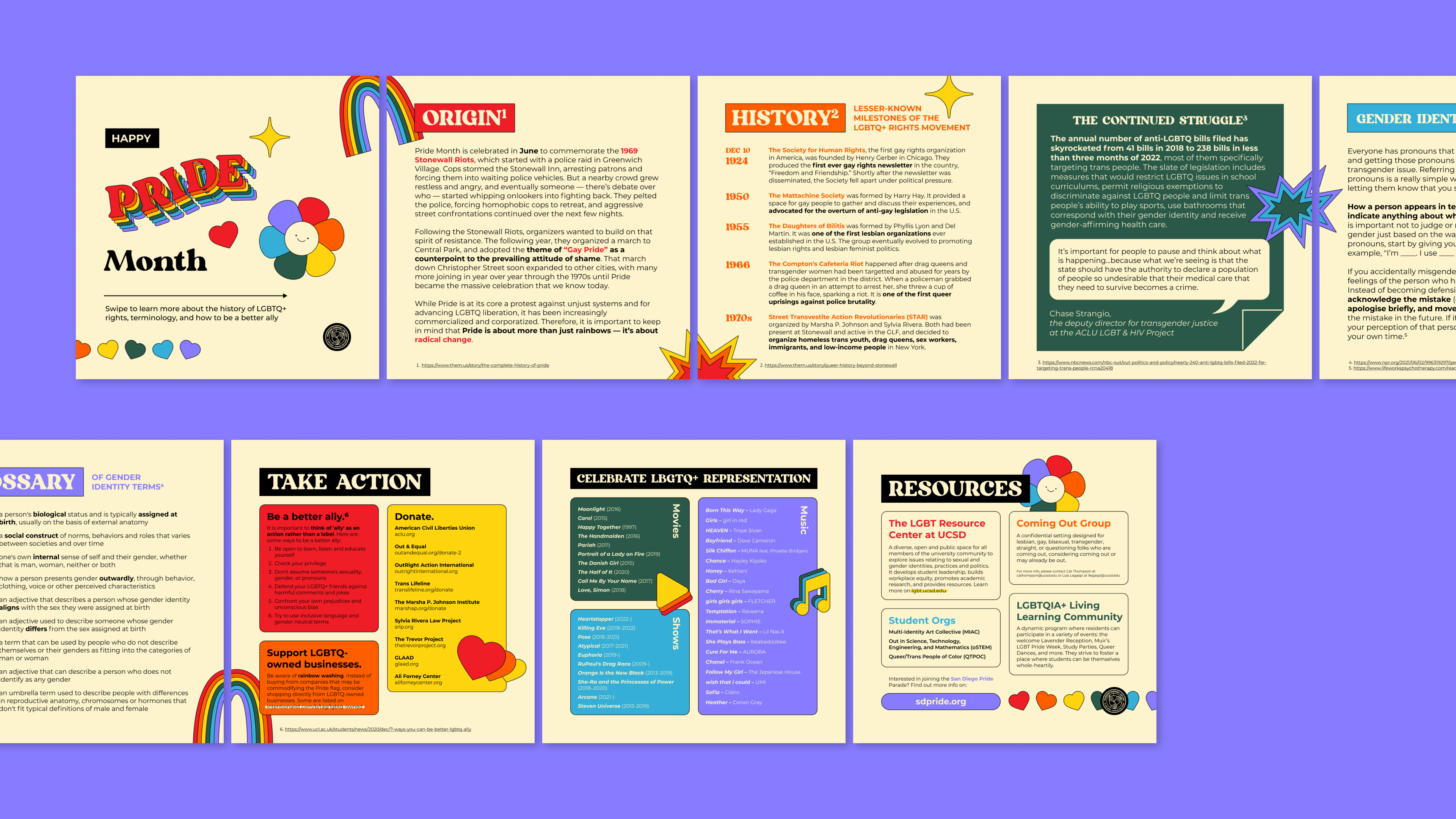 A major project that I initiated was creating infographics about heritage months to be posted on our instagram. The project echoes the college's values of diversity and justice, and mission on preparing students to become "engaged citizens who are committed to serving society". The infographics not only recognize and celebrate these months, but also educate students on the history and terms related to the social struggles. Moreover, they raise awareness on issues that the communities continue to face and encourage students to take action. Here are some examples: